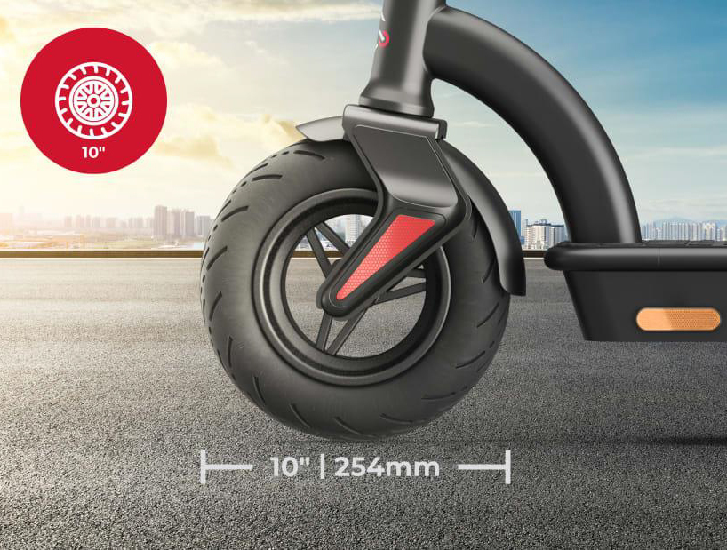 Οι μεγάλοι, φουσκωτοί τροχοί 10" παρέχουν μεγάλη σταθερότητα, πιο απαλή οδήγηση και την ικανότητα να χειρίζεσαι εύκολα τις ρωγμές και τα συντρίμμια. Αυτός ο τύπος τροχών σου προσφέρει μια όμορφη άνετη οδήγηση, την οποία θα εκτιμήσεις πραγματικά σε αυτά τα μεγαλύτερα ταξίδια.